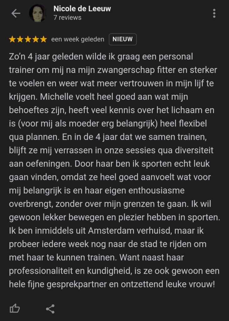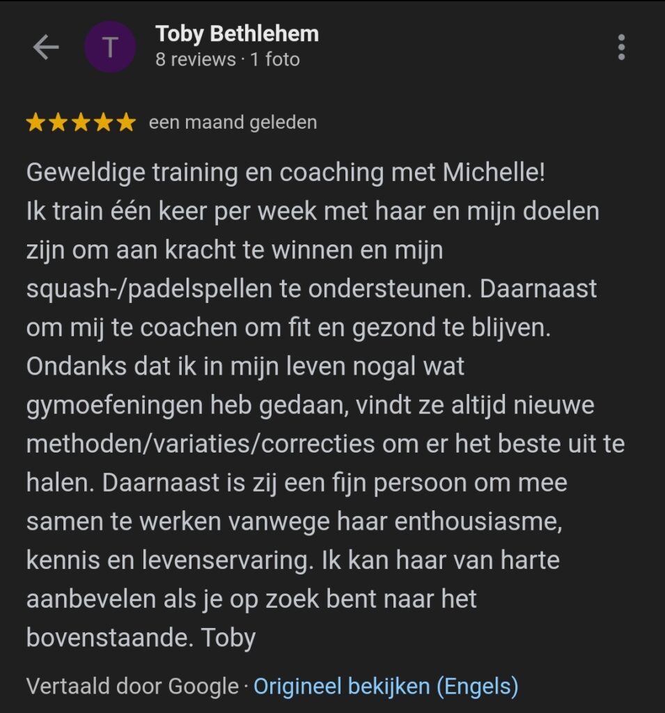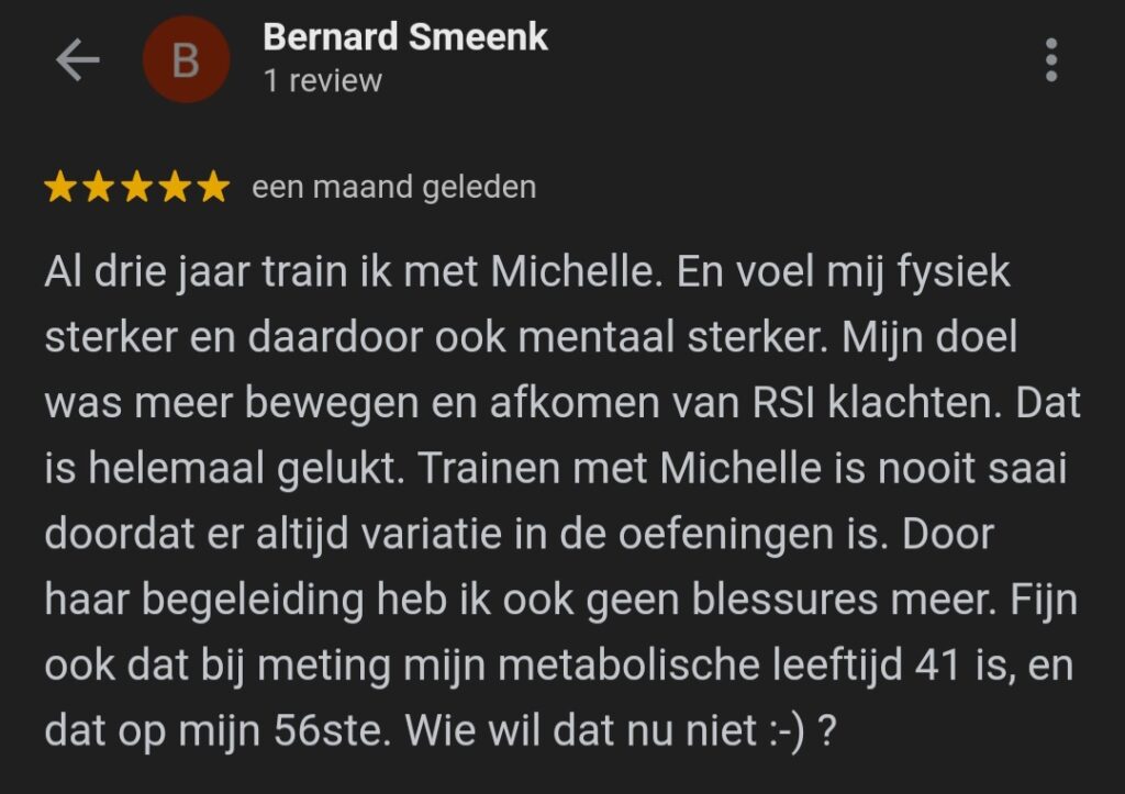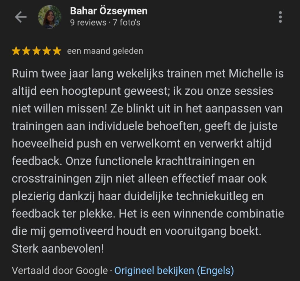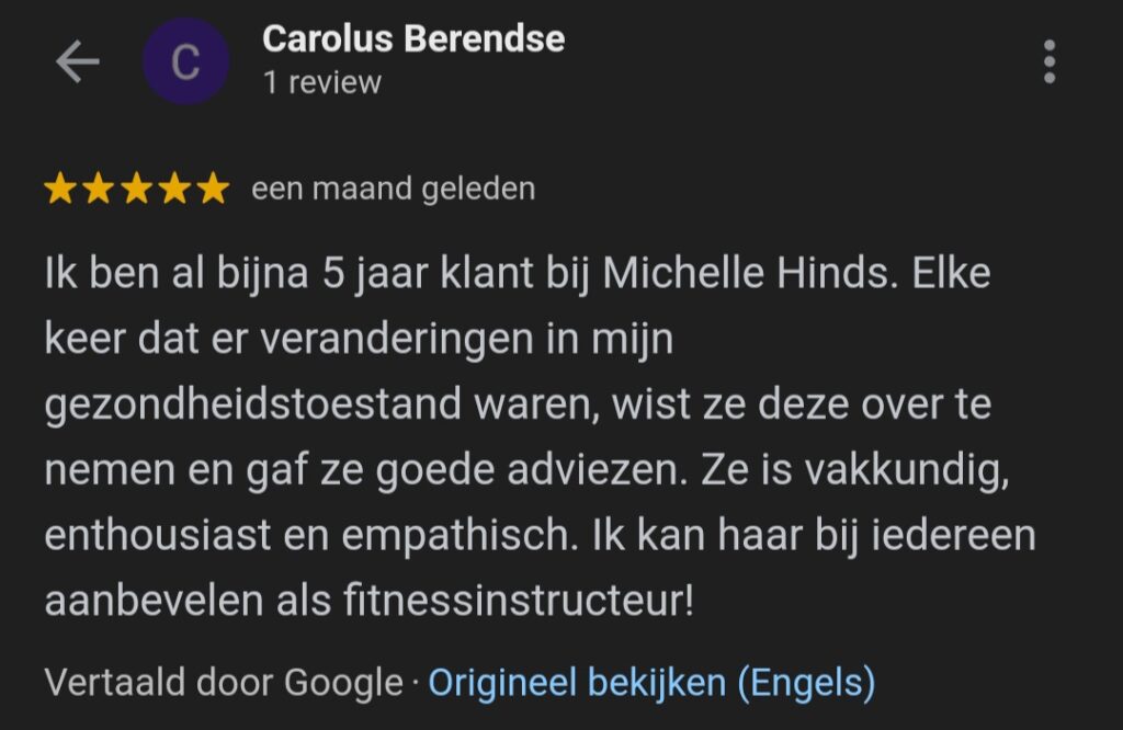 Welcome to my review page, where I proudly and gratefully share my customers’ appreciation. I strive for excellence in providing personalized training that not only delivers physical results, but also has a positive impact on the well-being of my clients. My 5-star Google reviews are a testimony to the dedication and expertise I work with. Discover with this selection of 6 examples why my clients choose Michelle Hinds Personal Training.